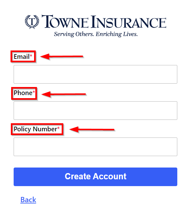 3. Enter your email address, phone number, and policy number and select 'Create Account'.